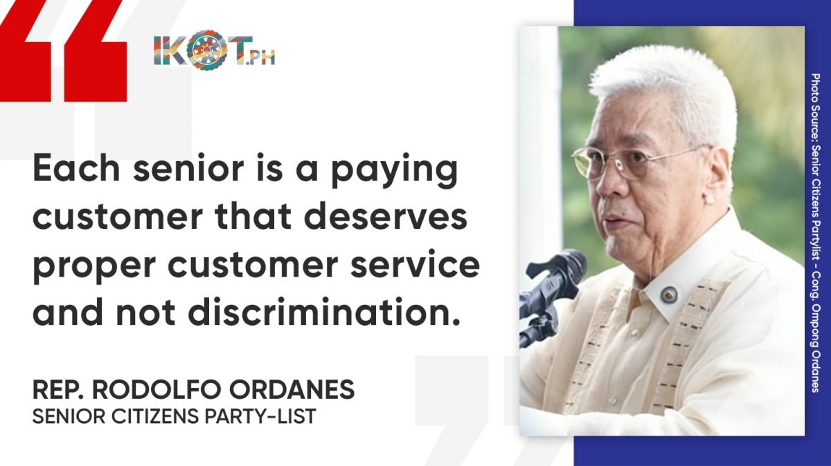 Senior Citizens Party-list Representative Rodolfo Ordanes has filed House Bill 5189 seeking to raise the senior citizen discount to 30% from the current 20% but only for seniors who are also persons with disabilities (SCWDs), while retaining its deductibility from gross income incentive for businesses.