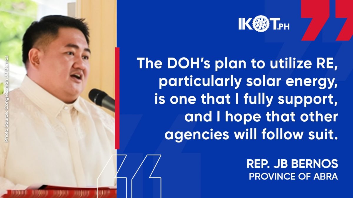 Abra lone district Rep. JB Bernos expressed his support for the Department of Health’s plan to use solar energy in hospitals and other health facilities.