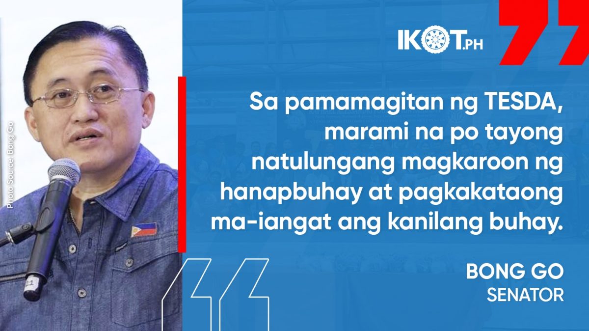 In his message during the graduation ceremony of Technical Education and Skills Development Authority (TESDA) graduates, Go said: “Sa pamamagitan ng TESDA at iba pang training institutions, marami na po tayong natulungang magkaroon ng hanapbuhay at pagkakataong maiangat ang kanilang buhay.”
