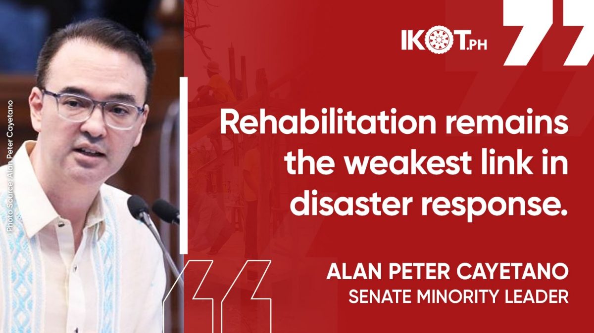The veteran legislator said rehabilitation remains the weakest link in disaster response, noting that families affected by previous calamities are often forgotten once new ones strike.