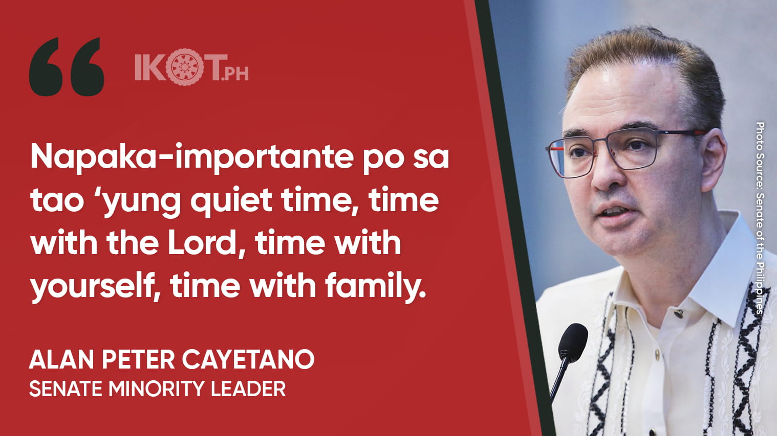 “Napaka-importante po sa tao ‘yung quiet time, time with the Lord, time with yourself, time with family,” Cayetano stressed.