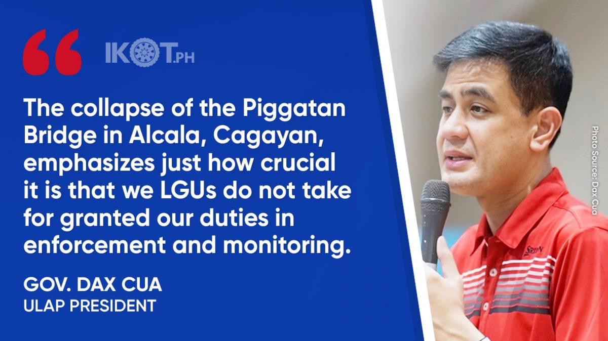 The collapse on Monday of a bridge in Cagayan province due to possible overloading emphasizes the need for local government units to closely monitor both compliance with load limits as well as the continued resilience of infrastructures in their jurisdiction, said Dax Cua, president of the Union of Local Authorities of the Philippines (ULAP).