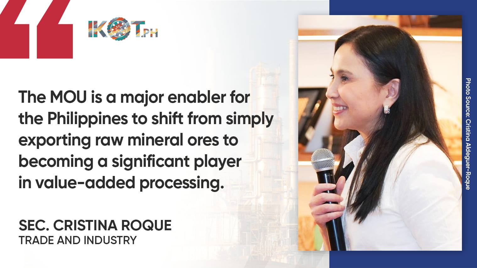 “The MOU is a major enabler for the Philippines to shift from simply exporting raw mineral ores to becoming a significant player in value-added processing,” Roque said.