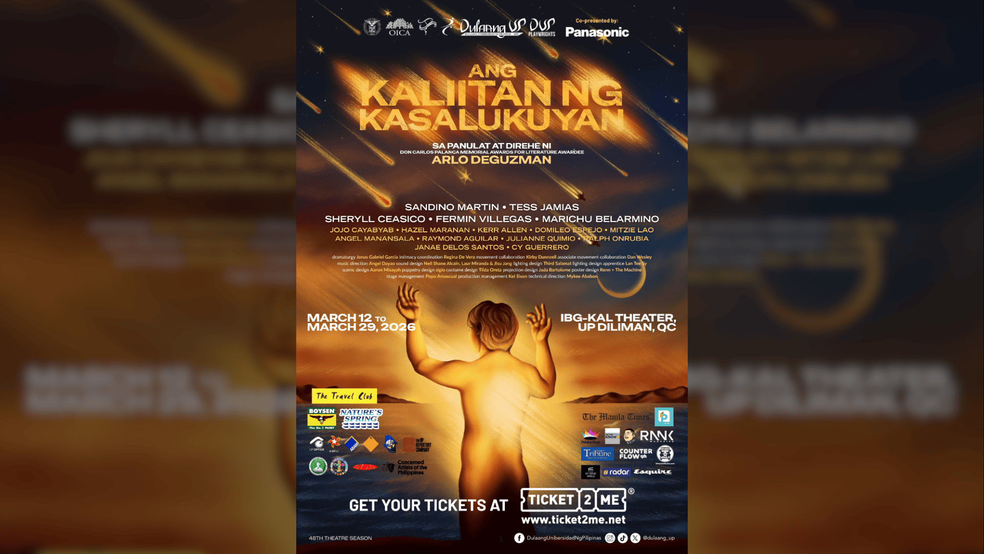 The production will run from March 12, 2026 to March 29, 2026 at the IBG-KAL Theater, UP Diliman; Thursdays and Fridays at 7:30PM, and Saturdays and Sundays at 2:30PM and 7:30PM. Tickets are available via https://bit.ly/AngKaliitanNgKasalukuyan2026 or direct purchase via https://bit.ly/AKKDirectPurchaseForm with the following prices: