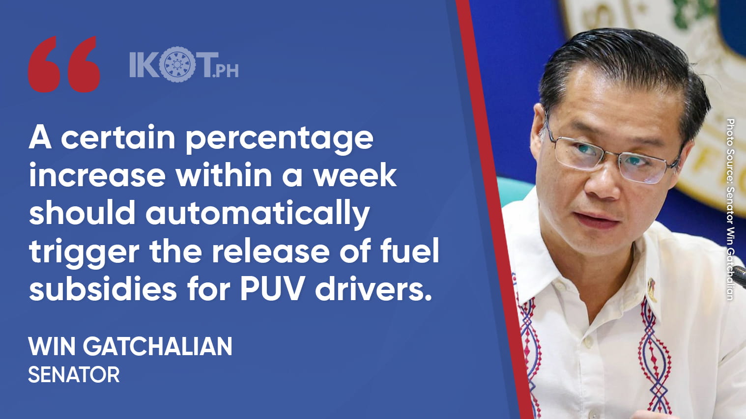 Senator Win Gatchalian is seeking to revise the fuel subsidy trigger formula for the public transport sector, shifting from a fixed price threshold to a percentage-based system to provide immediate relief for public utility vehicle (PUV) drivers amid expectations of further fuel price spikes.