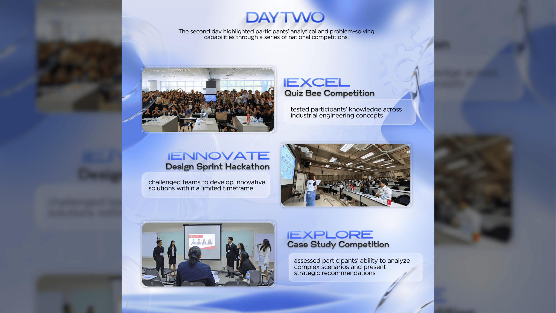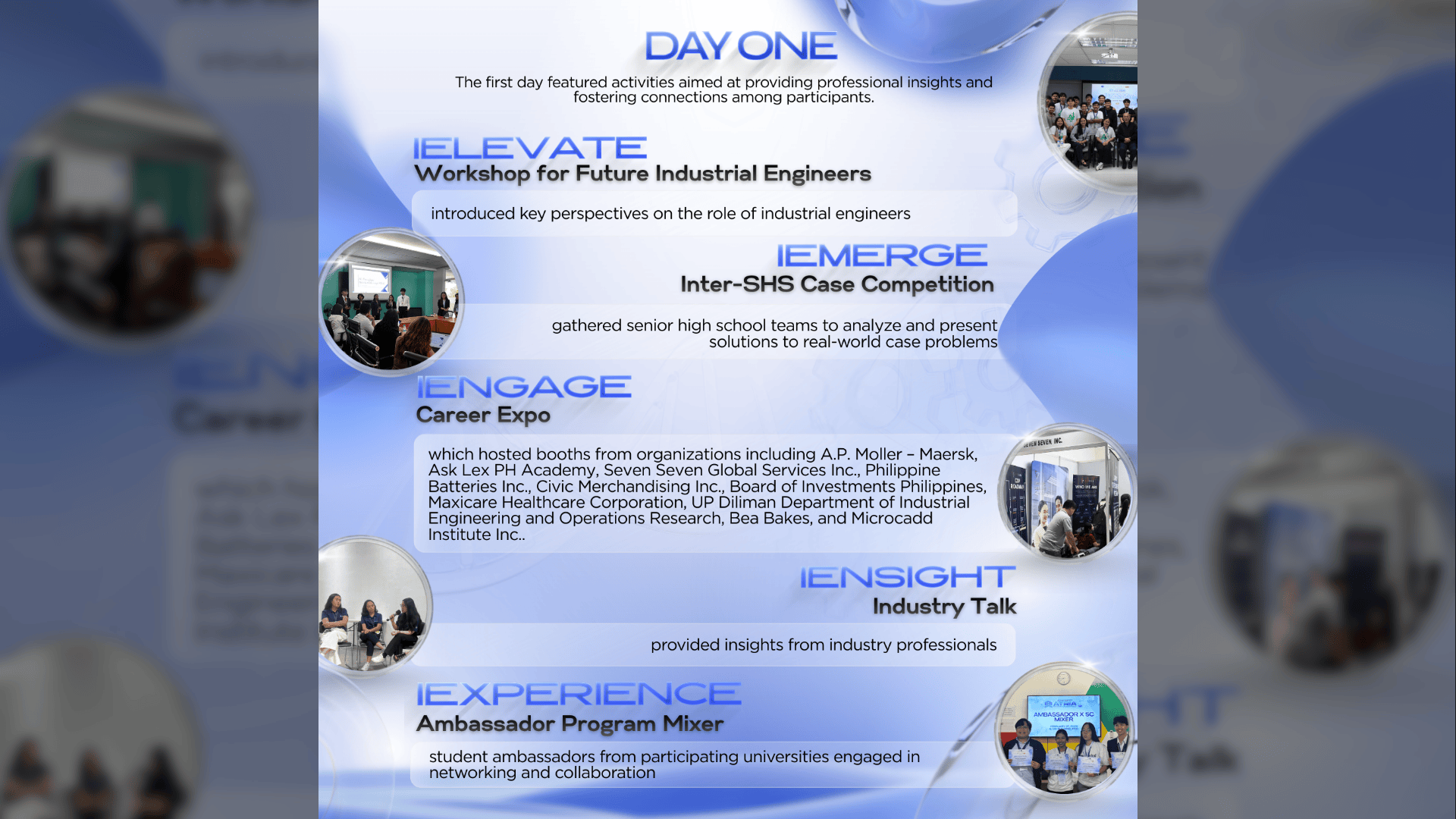The first day featured activities aimed at providing professional insights and fostering connections among participants. IElevate: Workshop for Future Industrial Engineers introduced key perspectives on the role of industrial engineers, while IEmerge: Inter-SHS Case Competition gathered senior high school teams to analyze and present solutions to real-world case problems. Participants also explored career opportunities during IEngage: Career Expo, which hosted booths from industry partners including A.P. Moller – Maersk, Ask Lex PH Academy, Seven Seven Global Services Inc., Philippine Batteries Inc., Civic Merchandising Inc., Board of Investments Philippines, Maxicare Healthcare Corporation, UP Diliman Department of Industrial Engineering and Operations Research, Bea Bakes, and Microcadd Institute Inc.. The day also included IEnsight: Industry Talk, which provided insights from industry professionals, and concluded with IExperience: Ambassador Program Mixer, where student ambassadors from participating universities engaged in networking and collaboration.