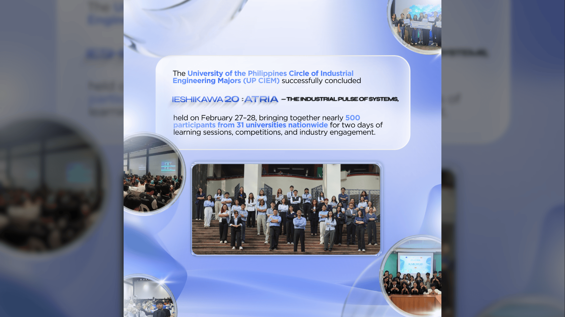 The University of the Philippines Circle of Industrial Engineering Majors (UP CIEM) successfully concluded IEshikawa 20 — ATRIA: The Industrial Pulse of Systems, held on February 27–28, bringing together nearly 500 participants from 31 universities nationwide for two days of learning sessions, competitions, and industry engagement.