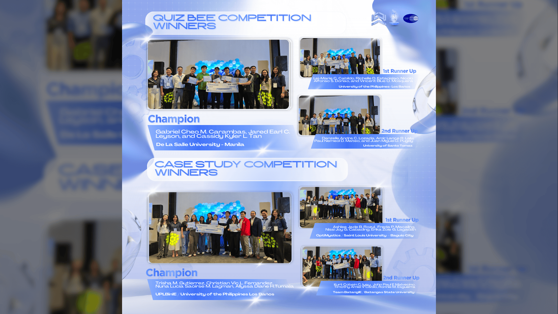 For the Case Study Competition, the championship title was awarded to UPLBhIE from the University of the Philippines Los Baños, composed of Trisha M. Gutierrez, Christian Vic L. Fernandez, Nuna Lucia Saoirse M. Lagman, and Allyssa Diane H. Tumala. OptiMystics from Saint Louis University – Baguio City placed 1st Runner-Up, while Team BatangNEU from Batangas State University finished as 2nd Runner-Up.