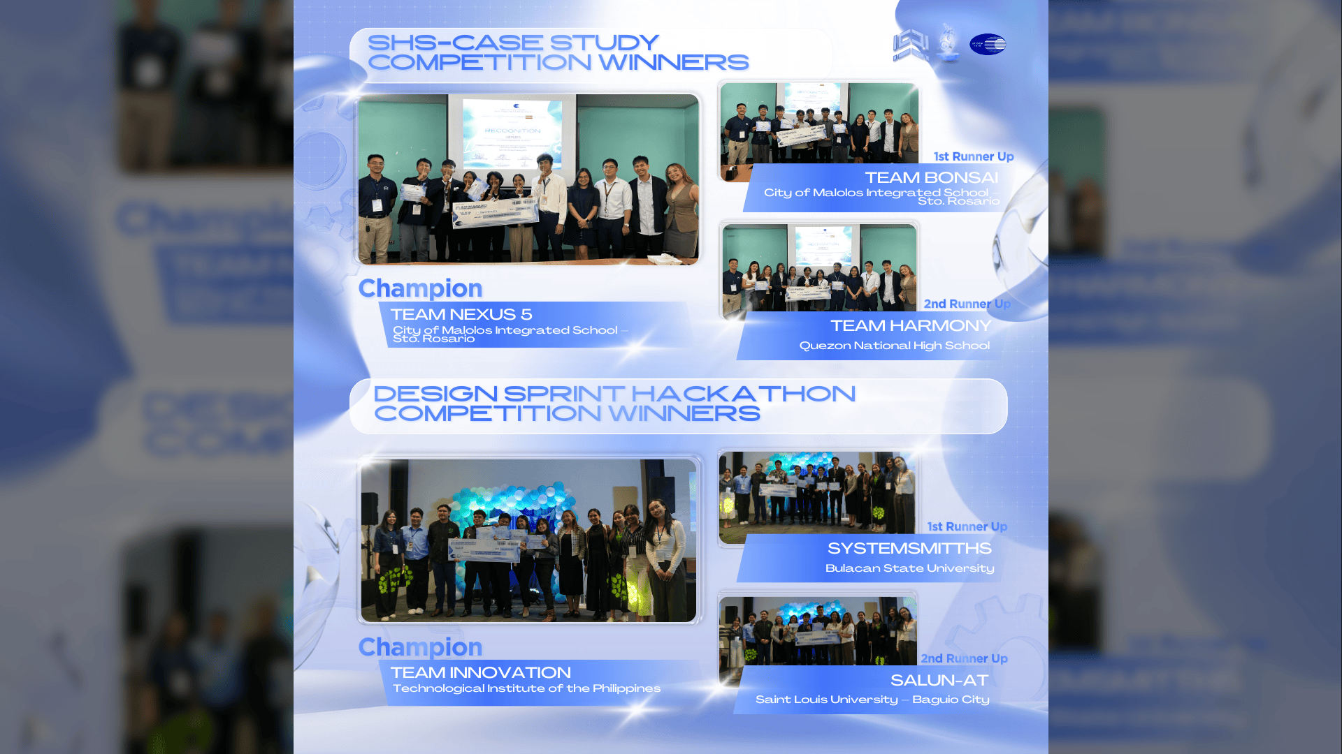 In the Design Sprint Hackathon, Team Innovation from the Technological Institute of the Philippines secured the top spot as Champion, with team members Rina Marie P. Fiestada, Mark Anthony L. Encallado, Raniel P. Cabalfin, and Jessica Faith C. Moncupa. The 1st Runner-Up position went to Systemsmiths from Bulacan State University, followed by Salun-at from Saint Louis University – Baguio City as 2nd Runner-Up.