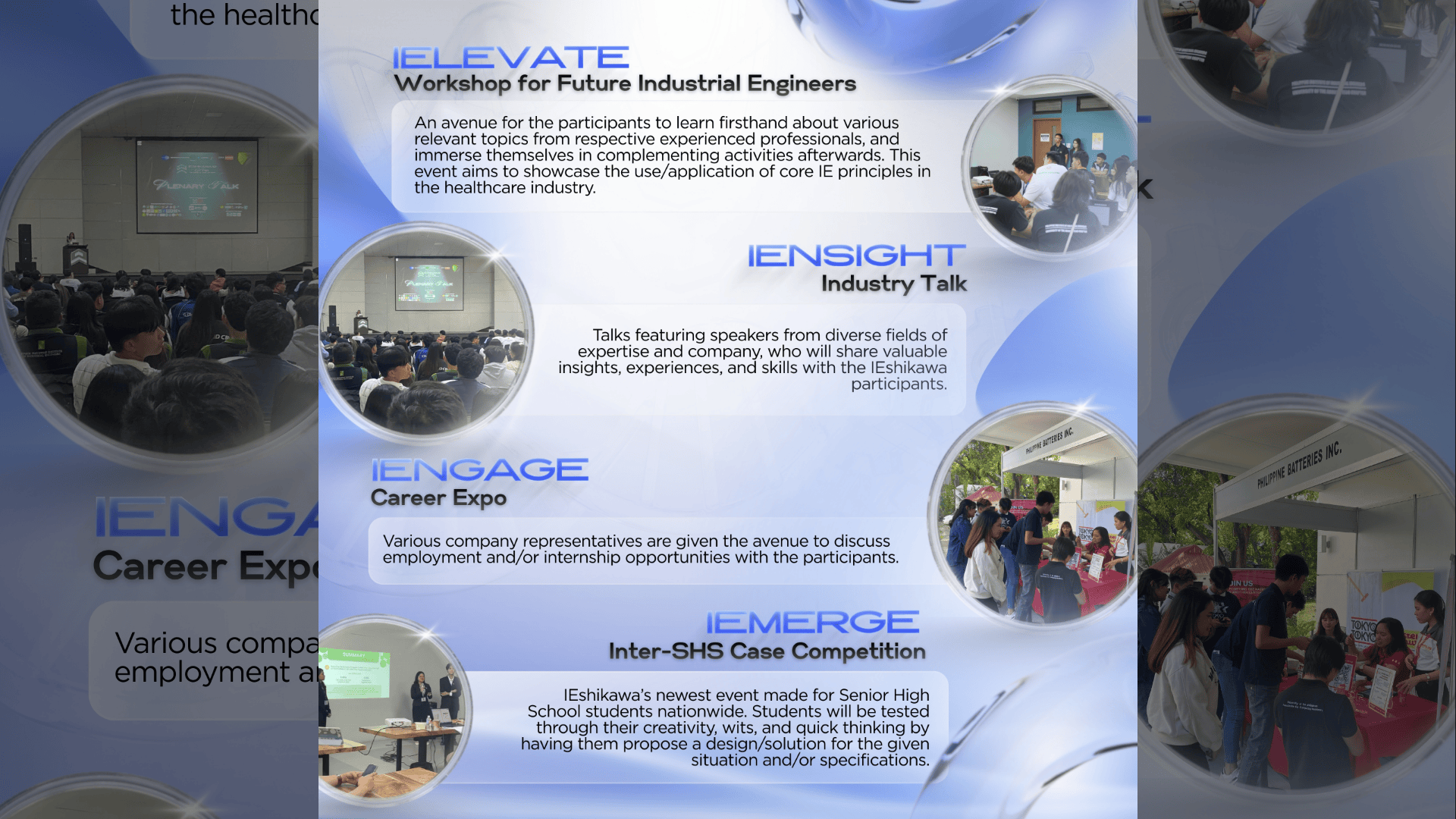- The IEngage: Career Fair serves as an avenue to discuss employment and/or internship opportunities with the participants, connecting aspiring Industrial Engineers with industry leaders and top-tier companies. It provides a platform for networking, career coaching, and direct recruitment, helping students bridge the gap between academic theory and professional practice.