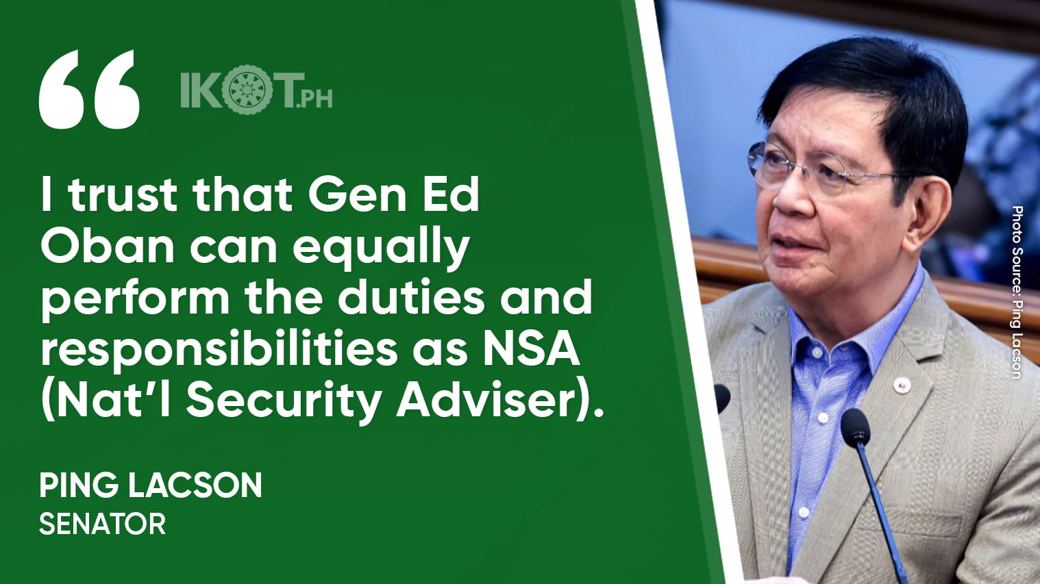 “Both retired 4-star generals are imminently qualified for the job as NSA. That being said, I wish Gen Ed Año well as he returns to private life as I wish him good health, even as I trust that Gen Ed Oban can equally perform the duties and responsibilities as NSA,” said Lacson, who had served in the military and has chaired the Senate committee on national defense.