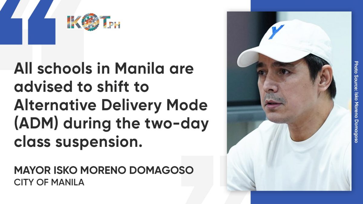 Domagoso said all schools in Manila are advised to shift to Alternative Delivery Mode (ADM) during the two-day class suspension.