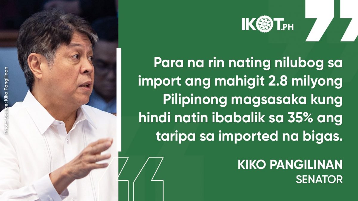 Through the leadership of Senator Kiko Pangilinan, the Senate adopted Resolution No. 29 urging Malacañang to revert the tariff rate on imported rice to 35% from the current 15% to reduce revenue losses of farmers, empower local rice producers, and bring down the prices of rice in the domestic market.