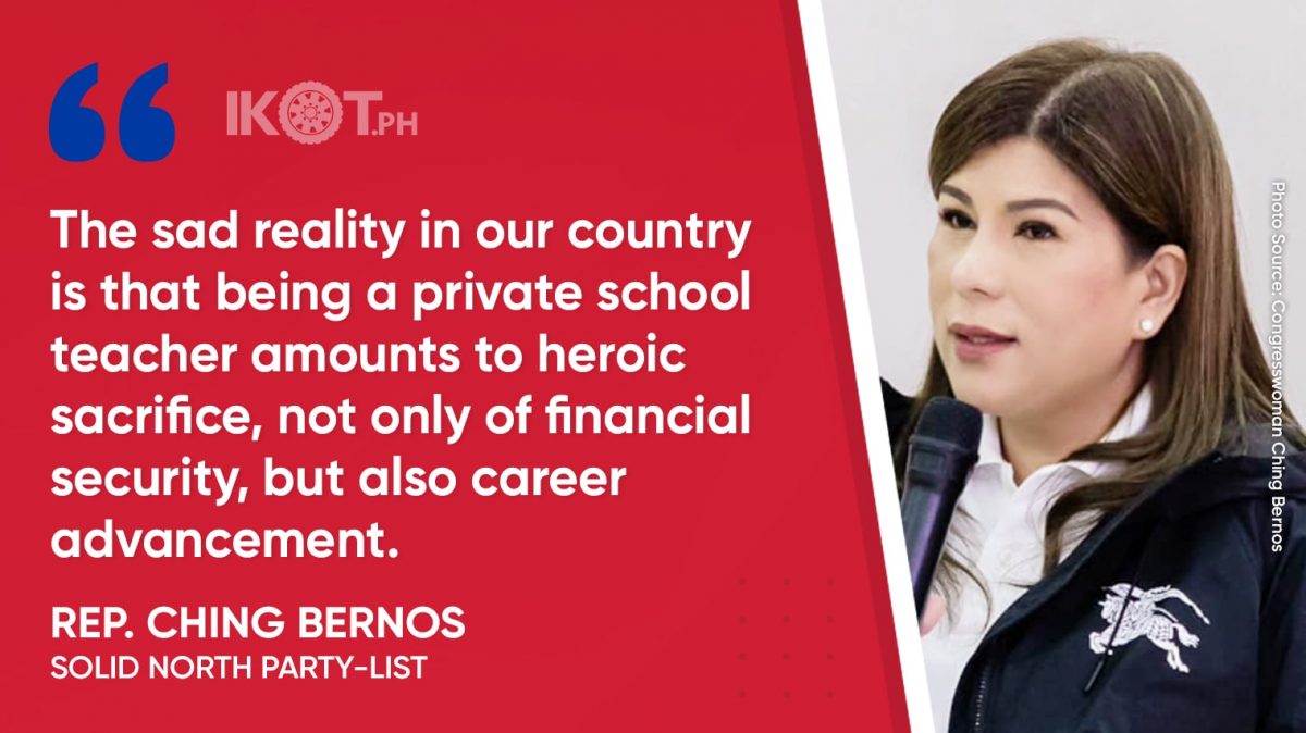 “The sad reality in our country is that being a private school teacher amounts to heroic sacrifice, not only of financial security, but also career advancement, especially for our private school teachers who lack the protection and advantages that their public school counterparts have,” said Solid North Party-list Rep. Ching Bernos, author of House Bill No. 3116.