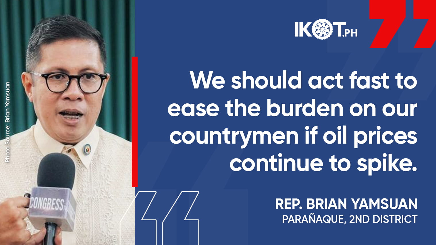 Parañaque 2nd District Representative Brian Raymund Yamsuan has proposed a temporary shift to work-from home setups and online classes to help cushion the impact on the public of the possible massive surge  in  oil prices resulting from the ongoing conflict in the Middle East